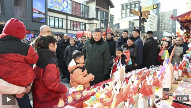 總書(shū)記察看街區(qū)風(fēng)貌和各式年貨攤位,同現(xiàn)場(chǎng)群眾親切交流。他愉快地向大家講起年少時(shí)多次到隆福寺的情景,還購(gòu)買了特色食品和文創(chuàng)產(chǎn)品。