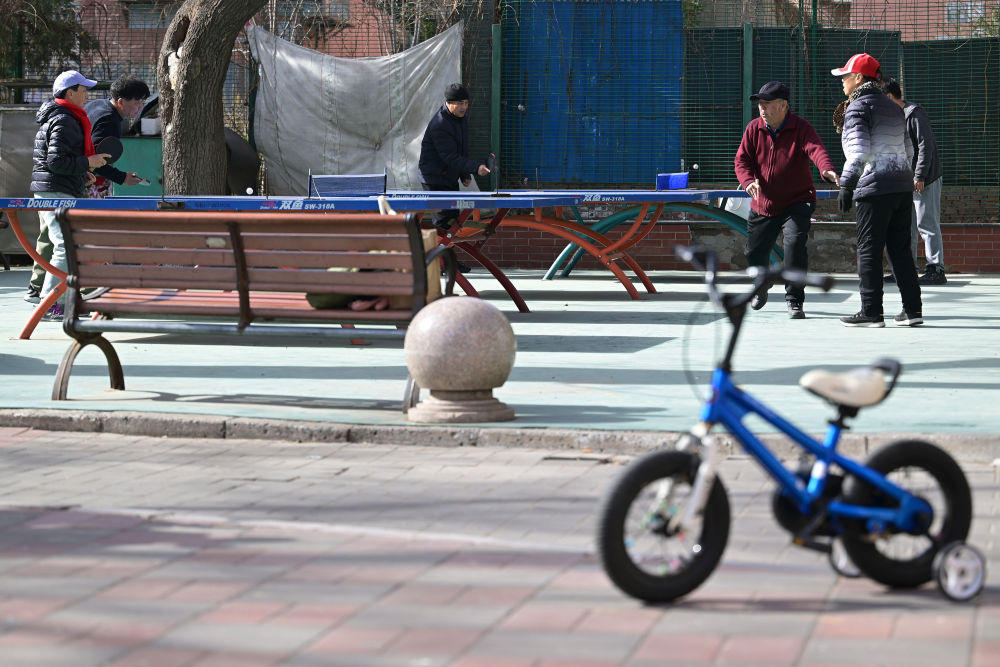 社區(qū)內(nèi),利用樓群間空地設(shè)置的乒乓球臺(tái)等健身設(shè)施為附近的老年居民提供了便捷的健身場所(2月10日攝)。