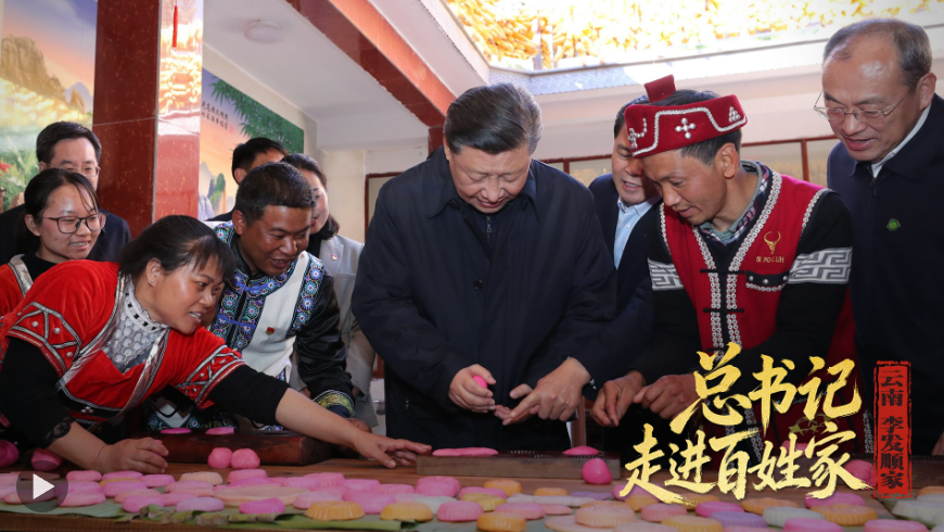 2020年春節(jié)前夕,習(xí)近平總書記走進(jìn)云南騰沖市清水鄉(xiāng)三家村中寨司莫拉佤族村,同村民李發(fā)順一家制作當(dāng)?shù)毓?jié)日傳統(tǒng)食品大米粑粑??倳浺贿B做了兩個(gè),笑著說(shuō):“摁了個(gè)福字,再來(lái)一個(gè)喜字,有福有喜。”