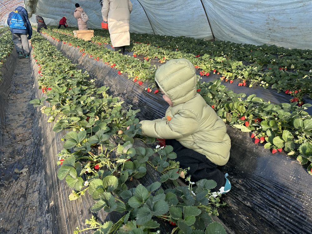 2026年1月22日,在河南洛陽(yáng)孟津區(qū)送莊鎮(zhèn)十里香現(xiàn)代農(nóng)業(yè)觀光園,前來(lái)研學(xué)的孩子們體驗(yàn)采摘草莓的樂(lè)趣。(受訪者供圖)
