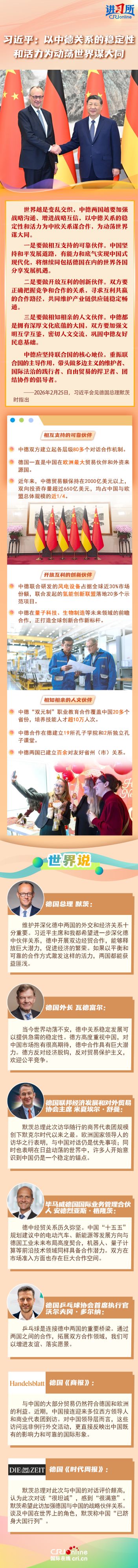 2月25日,中國(guó)國(guó)家主席習(xí)近平在北京會(huì)見(jiàn)來(lái)華進(jìn)行正式訪問(wèn)的德國(guó)總理默茨,就下一步中德關(guān)系發(fā)展提出三點(diǎn)意見(jiàn):一是要做相互支持的可靠伙伴、二是要做開(kāi)放互利的創(chuàng)新伙伴、三是要做相知相親的人文伙伴。習(xí)近平指出,世界越是變亂交織,中德兩國(guó)越要加強(qiáng)戰(zhàn)略溝通、增進(jìn)戰(zhàn)略互信,以中德關(guān)系的穩(wěn)定性和活力為中歐關(guān)系謀合作,為動(dòng)蕩世界謀大同。