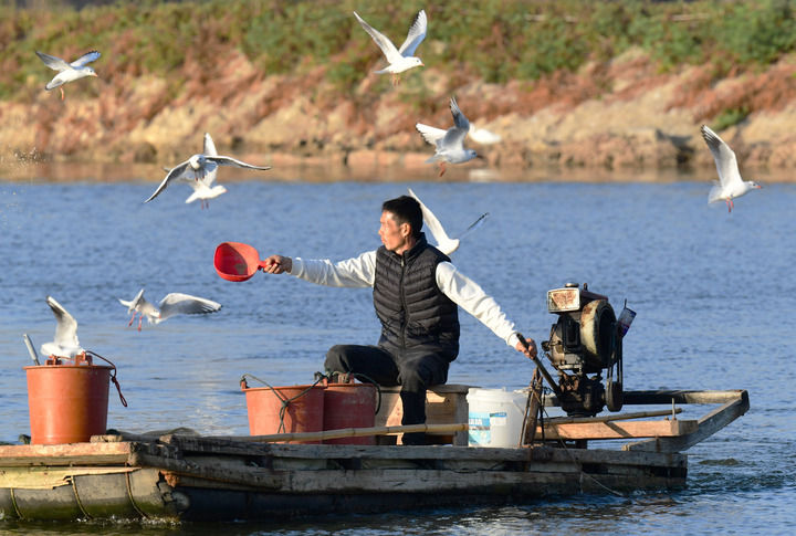 2025年12月10日,福建省漳州市佛曇鎮(zhèn)東坂村河豚養(yǎng)殖戶在給河豚投喂食物。