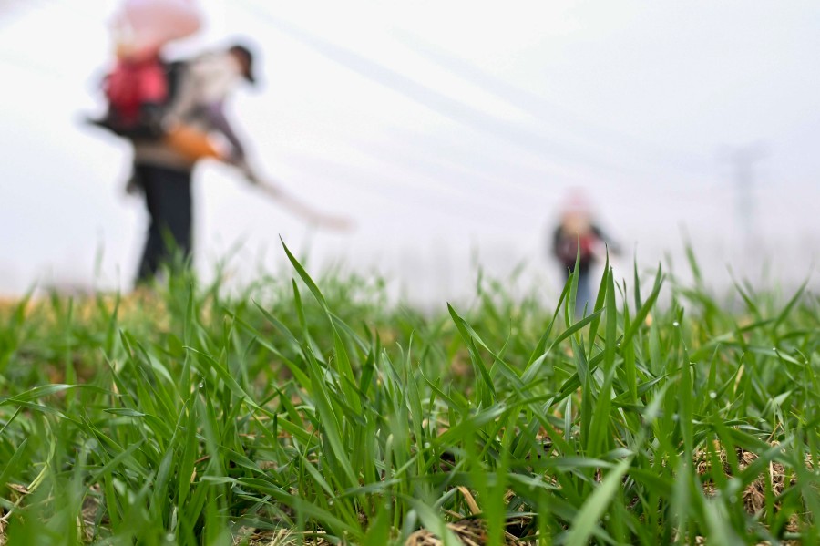 2026年2月4日,農(nóng)民在江蘇省昆山市錦溪鎮(zhèn)長(zhǎng)云村麥田間噴打化肥。新華社發(fā)(王須中攝)