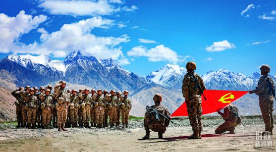 △新疆軍區(qū)某團(tuán)組織新黨員向黨旗宣誓。(解放軍畫報(bào)馬太郎拍攝)