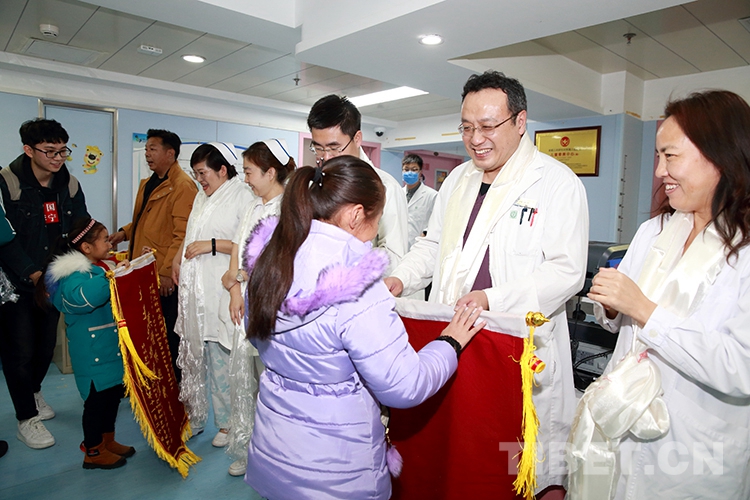 返鄉(xiāng)前,洛桑曲宗和次旦德吉在親屬和小學校長的帶領下來到兒研所,向醫(yī)護人員和共鑄中國心組委會的工作人員獻上了哈達和錦旗,表達感激之情。醫(yī)護人員也向兩個孩子贈送了書包等文具,鼓勵他們回校后好好學習。