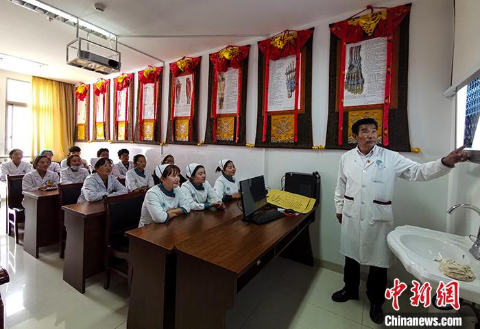 圖為9月2日,扎西次仁(右)為藏醫(yī)院醫(yī)護(hù)人員進(jìn)行培訓(xùn)。 中新社記者 張偉 攝