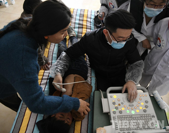 醫(yī)療隊和志愿者們不顧舟車勞頓和高原反應(yīng)的不適,認真地對每一位前來篩查的小朋友進行詳細的詢問和認真的檢查。對于有疑似癥狀的患者則現(xiàn)場利用從北京帶來的先進設(shè)備進行彩超診斷,并耐心和每一位患者家屬進行交流和講解,在每個工作細節(jié)上精益求精。