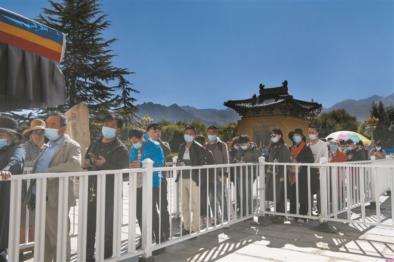 圖為游客佩戴口罩排隊進(jìn)布達(dá)拉宮參觀。記者 貢嘎來松攝