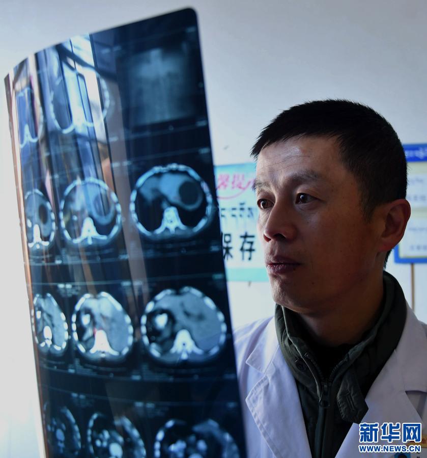 圖為西藏自治區(qū)第二人民醫(yī)院醫(yī)生張慶達(dá)在查看包蟲(chóng)病患者CT片(2017年11月14日攝)。新華社記者晉美多吉 攝