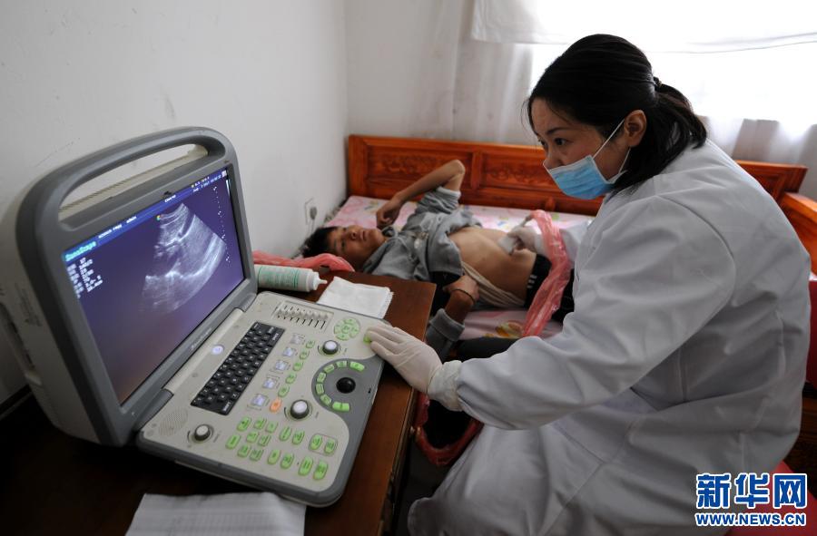 安徽省援藏醫(yī)療人員在西藏山南市錯(cuò)那縣勒門(mén)巴民族鄉(xiāng)為村民采用B超檢查腹腔,進(jìn)行包蟲(chóng)病篩查(2017年8月7日攝)。新華社記者晉美多吉 攝