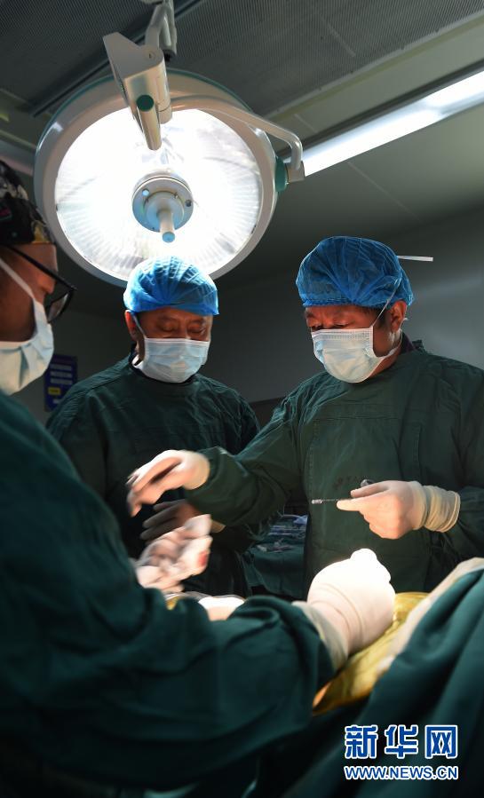 2017年5月26日,援藏醫(yī)生李家謀(右)帶領(lǐng)拉薩市人民醫(yī)院的藏族醫(yī)生進(jìn)行微創(chuàng)脊柱手術(shù)。 新華社記者 覺(jué)果 攝