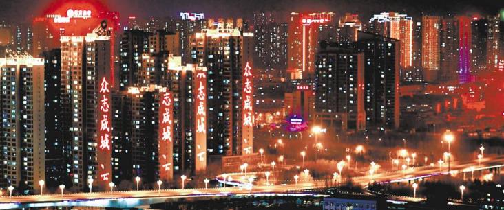 2020年2月8日晚,西寧部分樓體亮起了“眾志成城,抗擊疫情,人人有責(zé)”等抗擊疫情的字幕。記者 祁國(guó)彪 攝