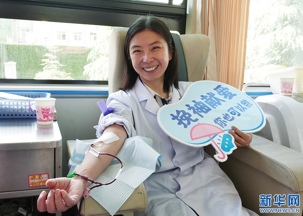 5月27日,來(lái)自北京協(xié)和醫(yī)院的援藏專家楊筱在獻(xiàn)血。(新華網(wǎng) 旦增努布攝)