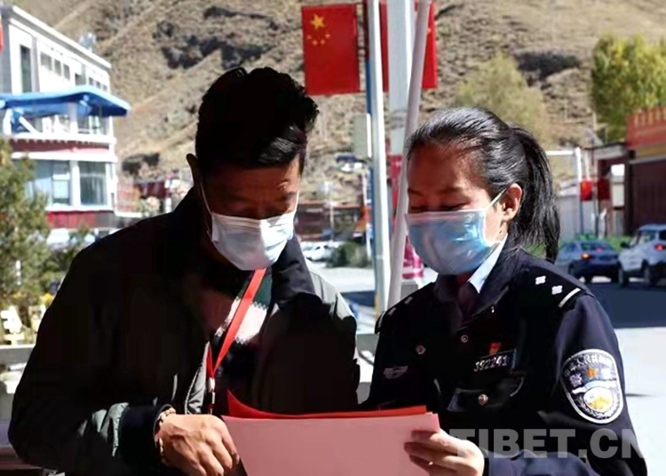 “出家門,戴口罩,少聚會,少串門,非常時(shí)期要留神。勤洗手,講衛(wèi)生,室內(nèi)開窗多通風(fēng)。舊口罩,要收起,有害垃圾要處理……”民警珠央正在使用漢藏雙語向駐地群眾宣講防疫口訣。