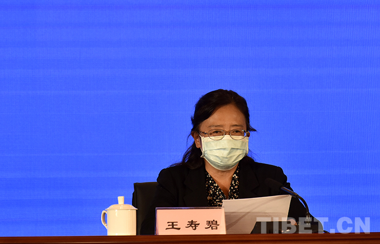 圖為西藏自治區(qū)新型冠狀病毒肺炎疫情防控工作第三場新聞發(fā)布會上,西藏自治區(qū)衛(wèi)生健康委員會一級巡視員王壽碧介紹西藏新冠肺炎疫情防控工作最新情況 攝影:王媛媛