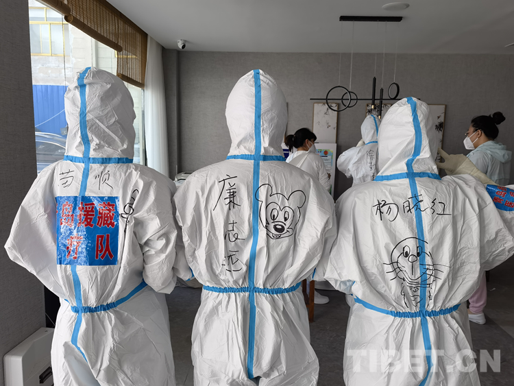 圖為青島“大白”們身著漫畫“戰(zhàn)袍”在日喀則戰(zhàn)“疫”一線合影留念