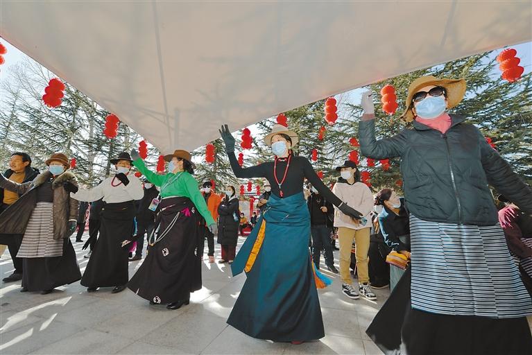 宗角祿康公園里群眾伴隨著音樂(lè)跳起歡快的鍋莊。記者 王敏 攝