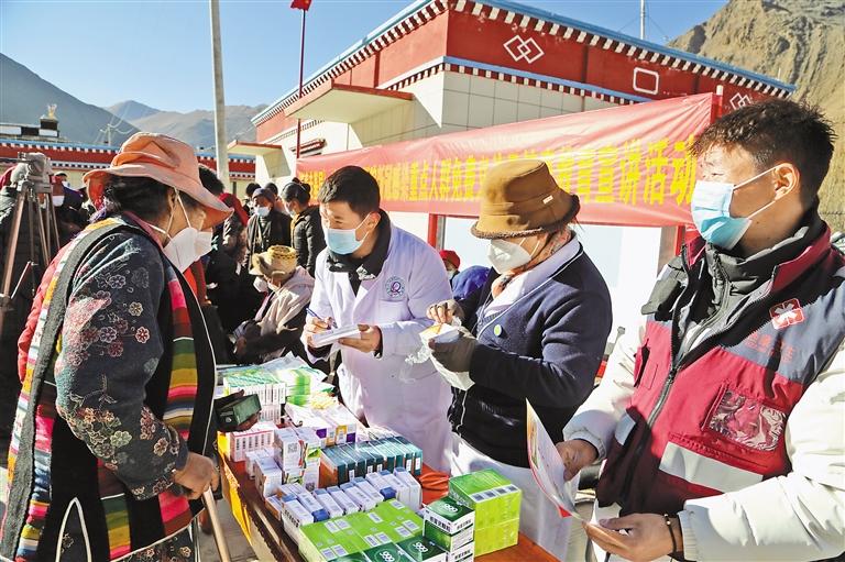 瓊結(jié)縣人民醫(yī)院醫(yī)生在為群眾發(fā)放免費(fèi)藥品。通訊員 倫珠澤仁 記者 次旺 攝