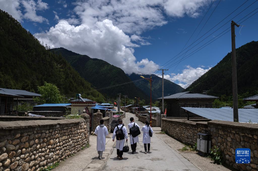 6月12日,入戶(hù)診治結(jié)束后,王振疆(左二)、王彤旭(右二)、陳冰(右一)和尼瑪益西走向村委會(huì)。新華社記者 費(fèi)茂華 攝