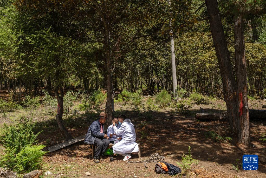 6月12日,在距離吞不絨村幾公里的路旁的樹(shù)下,王振疆醫(yī)生(右二)和尼瑪益西醫(yī)生(右一)在給普布多吉檢查身體。新華社記者 晉美多吉 攝