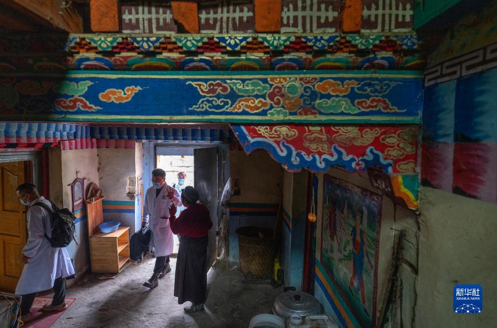 6月12日,王振疆(右)、王彤旭(中)、陳冰(左)來(lái)到吞不絨村一戶(hù)患者家中送醫(yī)上門(mén)。新華社記者 晉美多吉 攝
