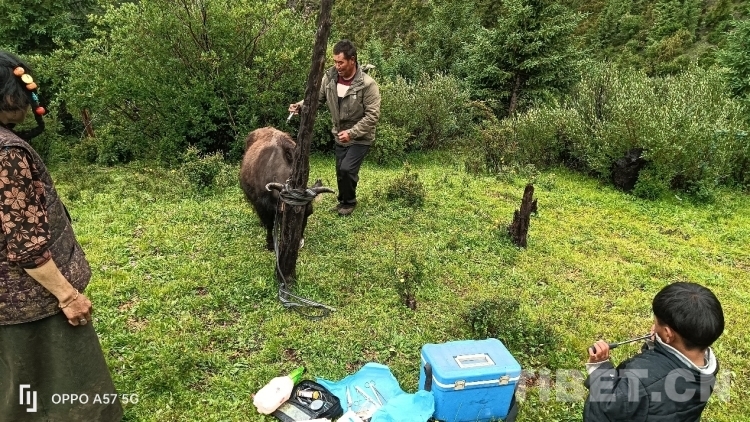 只見那頭受傷的牛被拴在木樁上,尾巴處還帶有一些血跡,顯得非常虛弱。索杰醫(yī)生先是把手術(shù)的傷口處仔細(xì)檢查了一遍,然后取來藥箱,在傷口處給藥,他告訴牧民家的男主人,?;謴?fù)得還可以,不要太擔(dān)心,留下的藥是這幾天涂抹和口服的,要按時服用。
