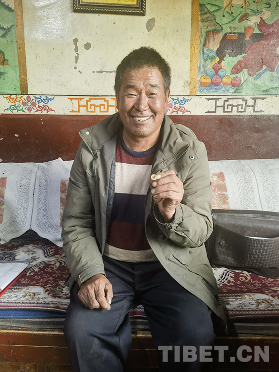 索杰醫(yī)生取出第三個包的時候,格外小心翼翼。我們因此也就更好奇,里面又是什么“寶藏”?!拔?986年入黨,1997年當(dāng)村大隊的副隊長。2010年,鄉(xiāng)里在12個村的大隊長中,選兩名優(yōu)秀人員,我就是其中之一。”索杰醫(yī)生邊說,邊慢慢拿出一個盒子,打開盒蓋,把手在衣服角上抹抹,然后取出一枚金黃閃亮的毛主席像章?!爱?dāng)時我們縣一共去了20人,先到那曲市委黨校學(xué)習(xí)了8天,然后到北京和大連分別參觀學(xué)習(xí)7天。在北京,我去了毛主席紀(jì)念堂、天安門、長城、鳥巢、水立方。我在天安門廣場買了鮮花,到毛主席紀(jì)念堂門口時,先是有點(diǎn)緊張,因?yàn)槟抢镎緧彽能娙?。我把鮮花放在一個統(tǒng)一的地方,瞻仰毛主席遺容時,我緊張的心情一下子沒有了,都變成了激動?!彼鹘茚t(yī)生把手放在心臟的位置比劃著,“為了紀(jì)念毛主席,我就買了一枚毛主席像章?!?/p>