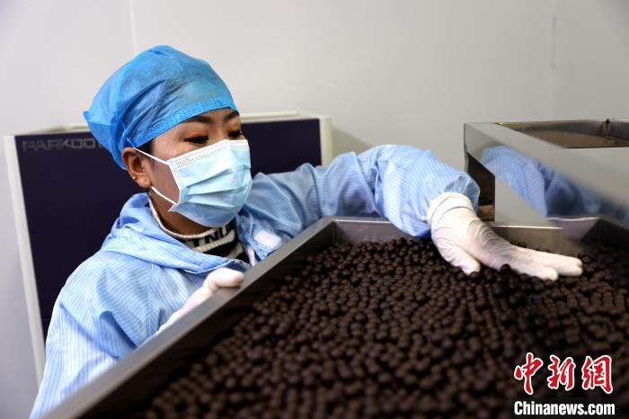 圖為藏藥制劑室工作人員晾曬藥丸。薛蒂攝