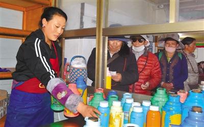 沖賽康“愛(ài)心飯館”位于拉薩老城區(qū)核心地帶,因“愛(ài)心飯館”飯菜量足、甜茶味道好,深受廣大居民群眾的喜愛(ài)。記者來(lái)到?jīng)_賽康“愛(ài)心飯館”時(shí),飯館內(nèi)早已座無(wú)虛席,每個(gè)窗口前都排滿了人,廚房?jī)?nèi)的工作人員更是忙得不可開(kāi)交。“甜茶已經(jīng)賣(mài)完了,請(qǐng)稍等一會(huì)兒,我們馬上做?!狈?wù)員向客人說(shuō)道。