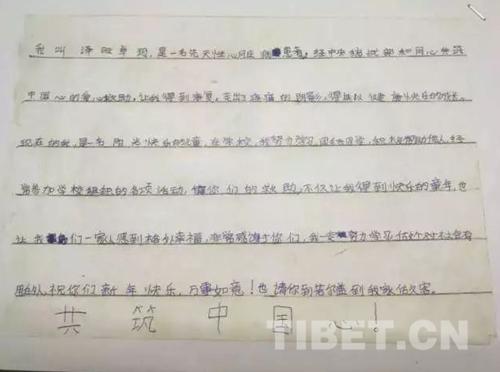 現(xiàn)在的我,是一名陽光快樂的兒童,在學校,我努力學習,團結同學,積極幫助他人,經常參加學校組織的各項活動,你們的救助,不僅讓我得到快樂的童年,也讓我們一家人感到格外幸福,非常感謝你們,我一定努力學習,做個對社會有用的人,祝你們新年快樂,萬事如意!也請你到若爾蓋到我家做客。