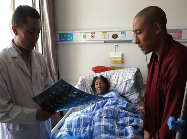 圖為玉樹州人民醫(yī)院醫(yī)生向病人家屬介紹手術(shù)后情況 圖片來源:青海新聞網(wǎng)