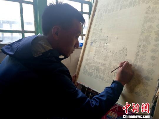 17日,古城拉薩八廓街一古建大院的一角,晉美和他的師兄盤腿而坐,專注著眼前的畫板,不時翻著手邊《四部醫(yī)典系列掛畫全集》的圖冊,藏醫(yī)藥典籍中的人體骨骼、脈絡在他們的筆下栩栩如生。