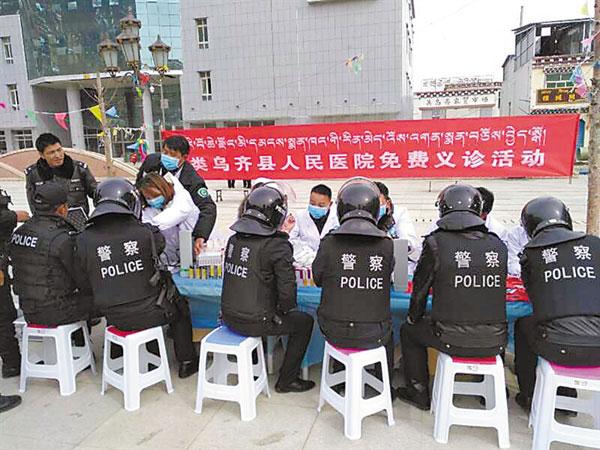 圖為類烏齊縣人民醫(yī)院醫(yī)護人員為一線執(zhí)勤公安干警進行免費義診現(xiàn)場。