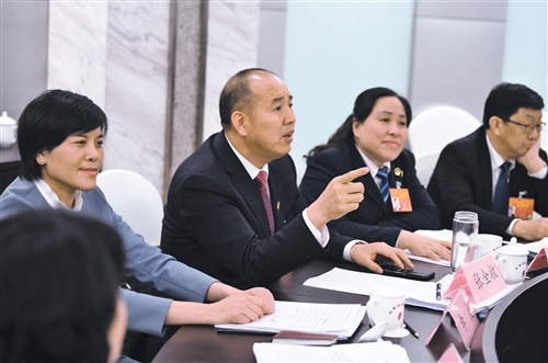 3月10日,人大河南代表團舉行全體會議,審議外商投資法草案。會上,全國人大代表張全收(右三)就保障用工人員基本醫(yī)療衛(wèi)生服務發(fā)言。經(jīng)濟日報-中國經(jīng)濟網(wǎng)記者李景錄攝