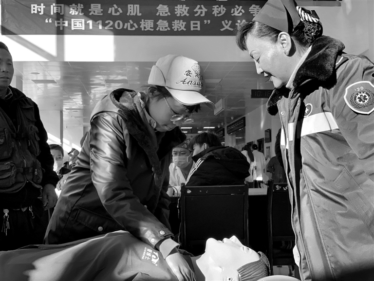 “發(fā)現(xiàn)心梗暈倒的患者,可以先嘗試喚醒對方意識,比如喊對方的名字。”20日一大早,記者在市人民醫(yī)院門診樓一樓看到,心梗救治實(shí)操剛剛開始便吸引了大量市民圍觀。