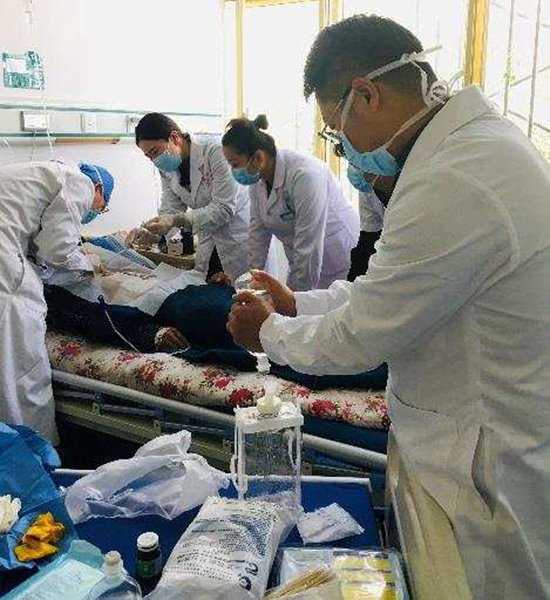 有一次,與解放軍920醫(yī)院為藏族群眾旺加聯(lián)合開(kāi)展右脛骨骨折切開(kāi)復(fù)位內(nèi)固定術(shù)時(shí),手術(shù)室沒(méi)有C臂透視機(jī),凳子數(shù)量不夠,只能憑借臨床經(jīng)驗(yàn)半蹲著馬步操作。高原反應(yīng)給身體帶來(lái)強(qiáng)烈的不適,隊(duì)員們?cè)?個(gè)多小時(shí)的手術(shù)時(shí)間里幾乎全程帶著氧氣,哪怕出現(xiàn)頭暈低血糖反應(yīng),仍努力堅(jiān)持到最后。手術(shù)結(jié)束后,因?yàn)獒t(yī)院電梯故障,隊(duì)員們又不顧身體的疲累,將患者旺加從2樓手術(shù)室抬到1樓病房。旺加的女兒每次見(jiàn)到醫(yī)療隊(duì)員查房、換藥時(shí),都會(huì)用漢語(yǔ)叫叔叔、阿姨,并拽著隊(duì)員們白大褂的衣角說(shuō)“謝謝”。