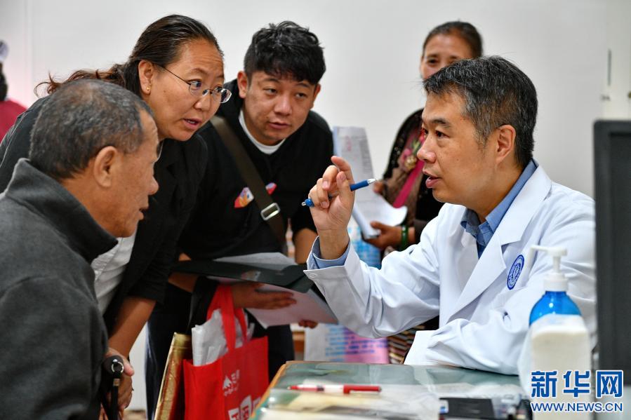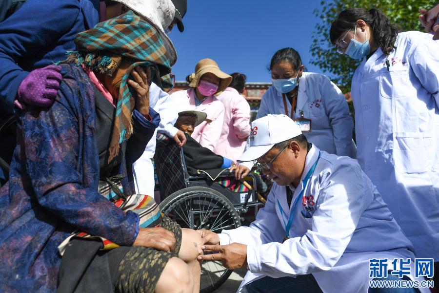在健康扶貧西藏尼木行公益活動(dòng)上,中醫(yī)大夫任志剛在拉薩市尼木縣福利院為老人診治(2017年9月17日攝)。新華社記者 普布扎西 攝