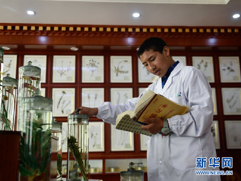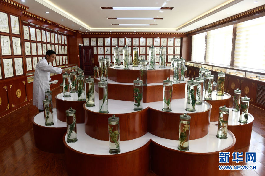3月16日,在果洛藏族自治州職業(yè)技術(shù)學(xué)校,2020級藏醫(yī)醫(yī)療與藏藥專業(yè)學(xué)生華旦在草藥標(biāo)本館內(nèi)辨認(rèn)藥材。新華社記者 張龍 攝