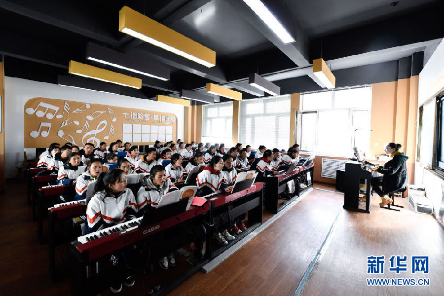 3月16日,在果洛藏族自治州職業(yè)技術(shù)學(xué)校,2020級學(xué)前教育專業(yè)學(xué)生在上音樂課。新華社記者 張龍 攝