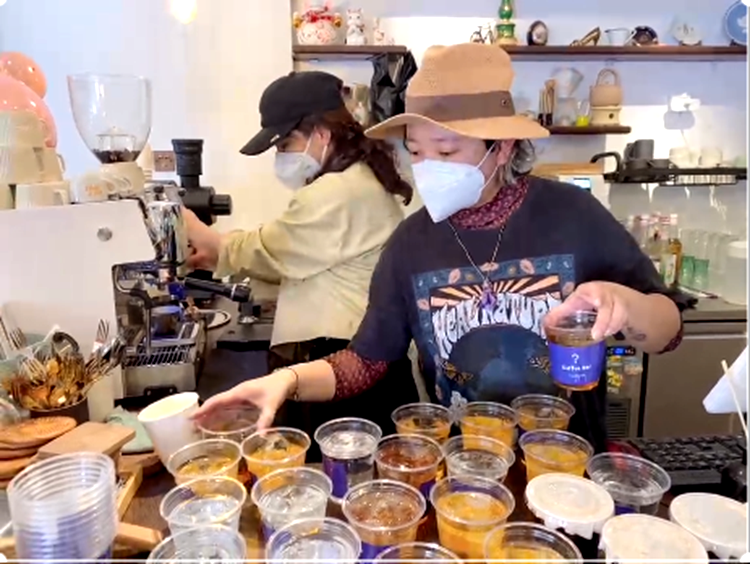 圖為“?Coffee Bar”咖啡店工作人員在為抗疫一線工作人員準備愛心咖啡