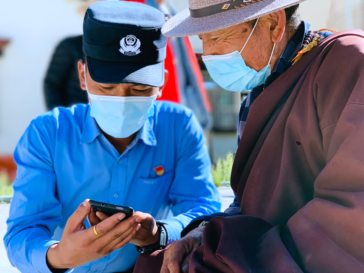 圖為在拉薩市林周縣一名黨員民警為老人講解“藏易通”的使用方法 攝影:何學(xué)兵