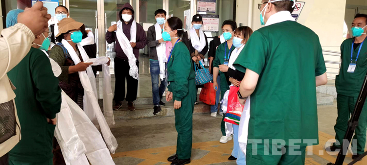 圖為8月18日下午 來自拉薩市方艙醫(yī)院出艙的第二批14名無癥狀感染者與醫(yī)護人員互獻哈達 由拉薩市融媒體中心供圖