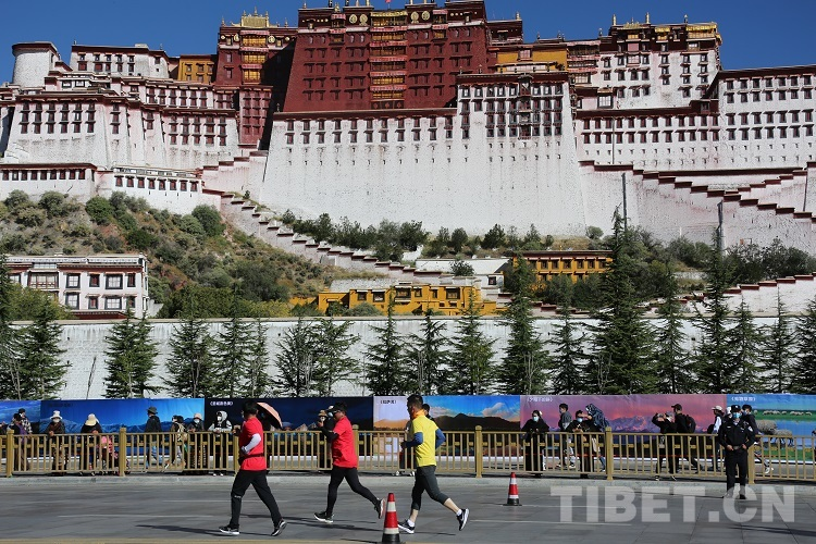 圖為2021年拉薩半程馬拉松選手經(jīng)過(guò)布達(dá)拉宮進(jìn)行最后的沖刺 攝影:王佳豪