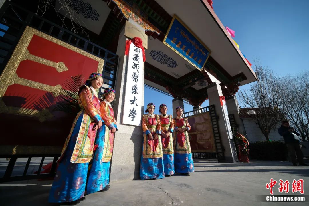2018年12月28日,西藏藏醫(yī)學(xué)院更名為西藏藏醫(yī)藥大學(xué)揭牌儀式在拉薩舉行,該校學(xué)生在校門(mén)前合影留念。何蓬磊 攝
