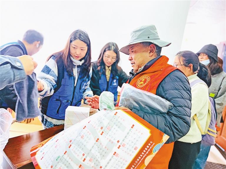 圖為工作人員為居民群眾發(fā)放宣傳冊。