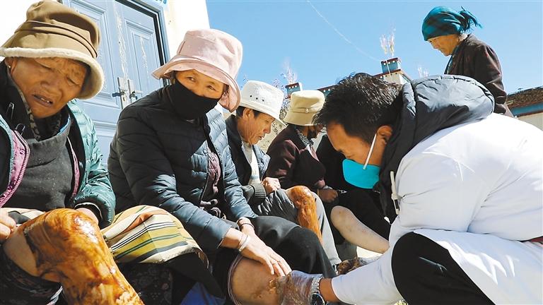 圖為措美縣家庭醫(yī)生服務(wù)團隊的醫(yī)生上門為老年人體檢并涂抹緩解關(guān)節(jié)疼痛的藥膏。通訊員 王利軍 攝