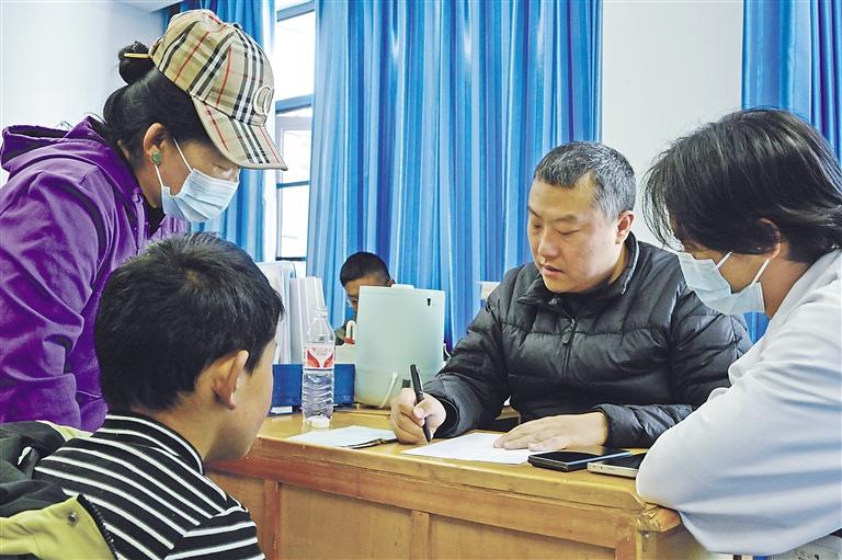 圖為在拉薩市城關區(qū)人民醫(yī)院內,江蘇“心佑工程”團隊的醫(yī)生對前來就診的兒童進行病史詢問、病例檢查。記者 王敏 洛桑 攝