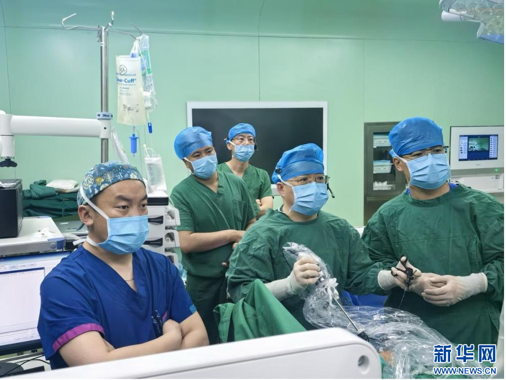 6月6日,黃金獅教授(第一排中間)和趙勇主治醫(yī)師(第一排右側(cè))在為先天性食管閉鎖患兒行胸腔鏡下食管閉鎖吻合術(shù)。(受訪者供圖)