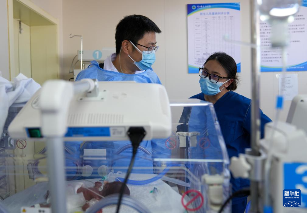 在那曲市人民醫(yī)院新生兒重癥監(jiān)護(hù)室,來(lái)自大連醫(yī)科大學(xué)附屬第一醫(yī)院的援藏醫(yī)生田聰亮(左)和護(hù)士旦珍合作為一名早產(chǎn)兒實(shí)施機(jī)械通氣治療(7月18日攝)。新華社記者 晉美多吉 攝 ??