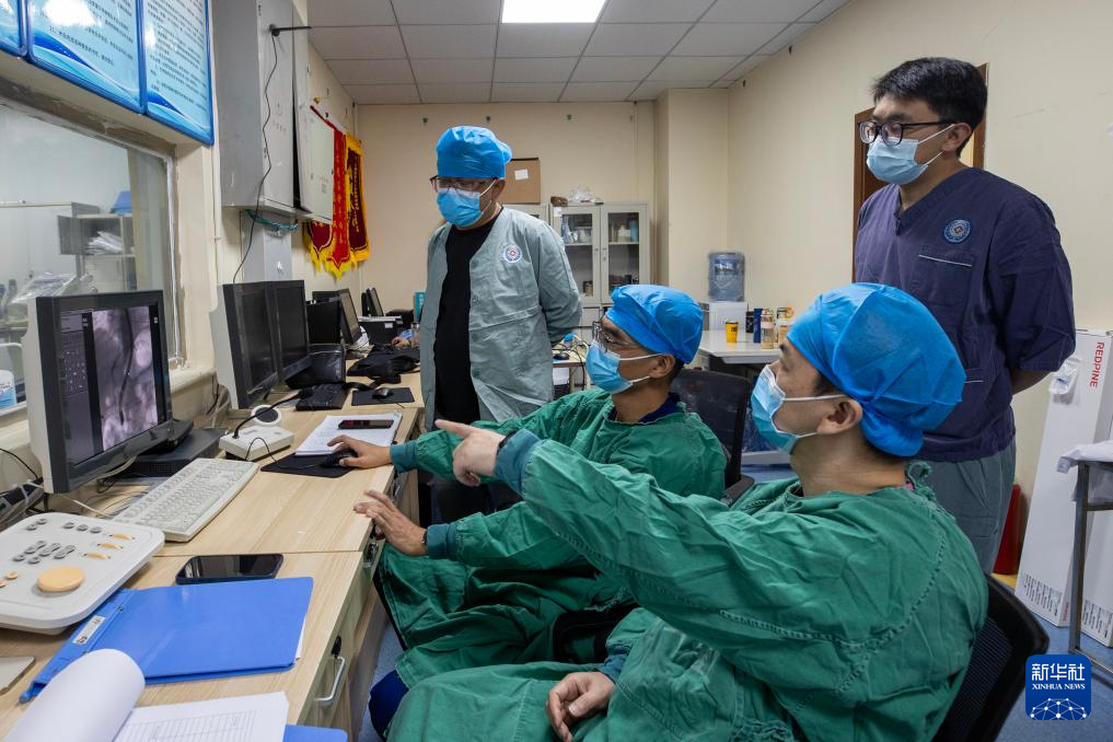 ?協(xié)和醫(yī)院第十批援藏醫(yī)生王強(qiáng)(左四)、第十一批援藏醫(yī)生蔣青偉(左三)和西藏自治區(qū)人民醫(yī)院醫(yī)生扎西(左一)在拉薩為患者施行內(nèi)鏡逆行胰膽管造影術(shù)(8月5日攝)。新華社記者 姜帆 攝 ??